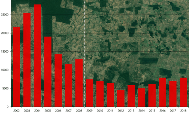 Whilst it is understood that its natural resources are a source of income, as is deforestation for agricultural expansion, it has been done at the cost of destroying the very habitats that sustain its biodiversity and other ecosystem services. Whilst deforestation rates reduced after 2008 the rate has seen a year on year increase since 2013. For the 12-month period August 2017 to July 2018 an increase of 13.7% has been recorded as compared with the previous 12 months see Fig 1 below (REDD-monitor.org, 2018).